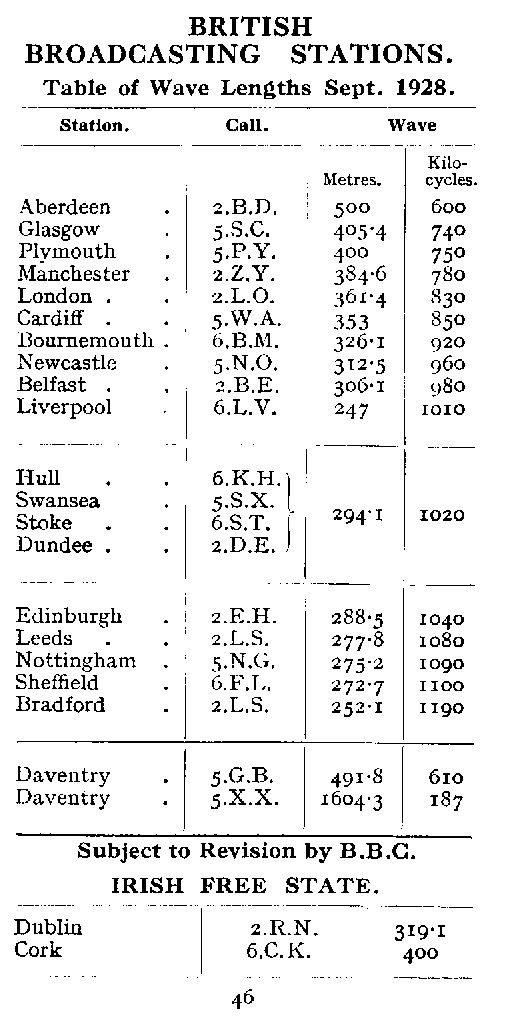 | Page 46 | British Broadcast Stations Table of Wavelengths September 1928 |